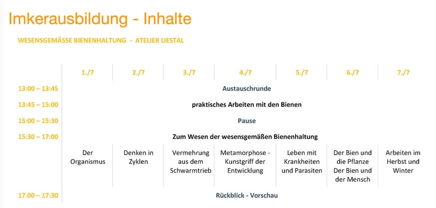 Der zweijährige Grundkurs vermittelt das Basiswissen einer "wesensgemässen Bienenhaltung" und befähigt den Kursteilnehmer zur Pflege und Führung von eigenen Bienenvölkern.